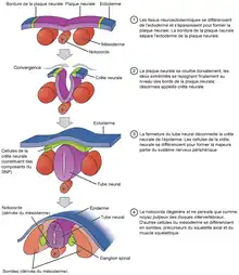 Chez les chordés, le système nerveux central est dorsal par rapport au tube digestif et à la chorde. La région dorsale de l'ectoderme s'épaissit pour former la plaque neurale et se referme en gouttière pour former un tube à l'origine de l'encéphale et de la moelle épinière. Les cellules à la frontière entre la plaque neurale et le reste de l'ectoderme donnent naissance aux cellules de la crête neurale qui sont à l'origine du système nerveux périphérique (et des mélanocytes).