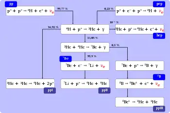86 % de tous les neutrinos solaires sont produits à partir de cette réaction. Comme on peut le voir sur l'image, les neutrinos solaires (chaîne proton-proton) dans le modèle standard solaire, le deutérium fusionnera avec un autre proton pour créer un noyau d'hélium 3 et un rayon gamma. Cette réaction est :