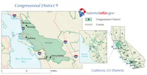 Avec le redécoupage avant les élections de 2022 en Californie, le 9e district est toujours centré sur Stockton. Cependant, Tracy, Manteca et Ripon, qui se trouvaient autrefois dans le 10e district congressionnel de Californie, font désormais partie de ce district, tandis qu'Antioch, Lathrop et Brentwood ne font plus partie du district. Antioche et Brentwood font partie du nouveau 10e district, qui est maintenant à l'ouest du 9e district(par opposition au sud)[2]. À partir des élections de 2022, Lathrop fera partie du nouveau 13e district[3].