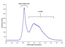 La longueur d’onde émise, qui dépend de la bande interdite du matériau, peut être contrôlée par le rapport GaN/InN : proche ultraviolet pour 0,02 In/0,98 Ga, 390 nm pour 0,1 In/0,9 Ga, violet-bleu à 420 nm pour 0,2 In/0,8 Ga, bleu à 440 nm pour 0,3 In/0,7 Ga, rouge pour des rapports plus élevés, aussi que par l'épaisseur des couches d'InGaN qui sont généralement de l’ordre de 2 à 3 nm. Cependant, les résultats des simulations atomiques ont montré que les énergies d’émission dépendent peu des petites variations des dimensions des dispositifs[10]. Des études basées sur la simulation de dispositifs ont montré qu’il pourrait être possible d’augmenter l’efficacité des LED InGaN/GaN en utilisant l'ingénierie de la bande interdite, en particulier pour les LED vertes[11].
