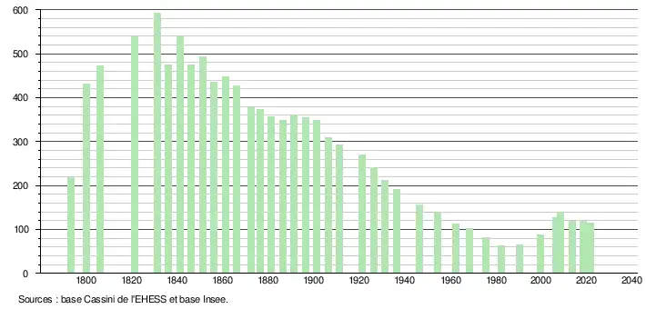 L'évolution du nombre d'habitants est connue à travers les recensements de la population effectués dans la commune depuis 1793. Pour les communes de moins de 10 000 habitants, une enquête de recensement portant sur toute la population est réalisée tous les cinq ans, les populations légales des années intermédiaires étant quant à elles estimées par interpolation ou extrapolation[18]. Pour la commune, le premier recensement exhaustif entrant dans le cadre du nouveau dispositif a été réalisé en 2008[19].