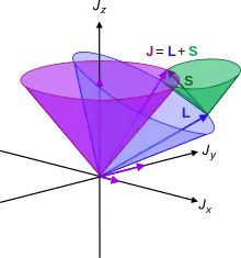 Si l'on tient compte de l'interaction spin-orbite, les opérateurs L et S ne commutent plus avec l'opérateur hamiltonien H, et leurs valeurs propres varient en fonction du temps. Il est alors nécessaire d'utiliser un autre jeu de nombres quantiques, parmi lesquels les nombres détaillés ci-dessous[3],[6].