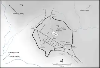 La ville est dominée au centre par un grand promontoire qui culmine à 460 mètres d'altitude, le major acropolis[n 1], sur lequel se dresse un temple attribué à Diane (tempio di Diana) et de nombreux autres monuments votifs. L'identification du temple de Diane est basée sur une inscription dédicatoire découverte sur un bassin en céramique et datée du IIe siècle av. J.-C.[8] Sur un autre promontoire situé au sud-est du premier, plus petit et baptisé minor acropolis, se trouvent deux temples, le tempio maggiore et le tempio minore[n 1]. Un autre temple, identifié comme dédié à Junon, le tempio di Giunone, se trouve au sud-ouest de la ville, près du mur d'enceinte. Le centre de la ville est occupé par un forum dont on devine encore la grande esplanade rectangulaire. Sur le côté sud, des vestiges ont été identifiés à un complexe thermal. Le système d'approvisionnement en eau consiste en une série de citernes dont les plus larges sont destinées à un usage public et les plus petites à un usage privé[8].
