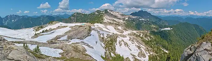 Panorama la montagne du Coliseum, dans le Lynn Headwaters Regional Park (en), une aire préservée du North Vancouver. Juillet 2021.