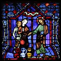 Jésus arrive à Cana, accompagné de ses disciples. Le dernier disciple porte un livre fermé : la vie publique n'a pas encore commencé[11]. Dans la Bible, le thème de la noce désigne symboliquement le temps de réconciliation que Dieu prépare pour son Peuple[18]. Dans le récit de Jean, cette noce terrestre préfigure la Nouvelle Alliance. |