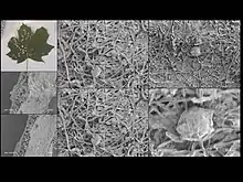 - La surface de la feuille frottée apparaît dessous, verte et marbrée de brun-jaune par la production de tannins toxiques qui restent accumulés en vain dans la vacuole. Le parasite n'altère pas les cellules épidermiques, ce qui rend la réaction de défense du chêne contre lui sans effet. cf. Marc-André Selosse, Les Goûts et les couleurs du monde. Une histoire naturelle des tannins, de l'écologie à la santé, Actes Sud Nature, , p. 87