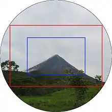 En rouge, la zone couverte par un capteur ou un film 24 x 36 mm. À l'intérieur, en bleu, la zone couverte par un capteur au format APS-C.