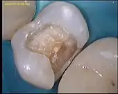 Le dentiste peut également utiliser un laser dentaire (sono-abrasion par ultra-sons) ou des instruments d'air abrasion par sablage (technique utilisée notamment pour traiter les lésions situées entre deux dents), si l'émail des dents à traiter n'est pas trop épais, si la carie est débutante[1], ainsi que des appareils à ozone dans le même cas de figure. L'intervention au laser est généralement plus coûteuse que l'intervention à la fraise.