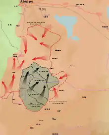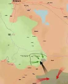 Le 20 janvier, les troupes du régime s'emparent de l'aéroport d'Abou Douhour[122]. Les forces venues du sud et celles venues du nord font leur jonction par la même occasion[122],[123]. Environ 2 000 à 2 500 combattants de Hayat Tahrir al-Cham se retrouvent alors encerclés dans une poche à l'est de d'Abou Douhour, coupés de la ville d'Idleb[122],[123]. Cette poche tombe le 25 janvier aux mains de l'État islamique, qui contrôle alors 82 villages[11]. Entre-temps, l'armée syrienne prend la ville d'Abou Douhour le 22 janvier[124]. À cette date, les loyalistes se sont emparés de 322 villages[125].