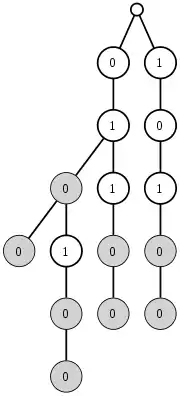 Ici, nous avons quatre programmes possibles, correspondant aux quatre feuilles de l'arbre : "01(00)", "011(00)", "0101(00)", et "101(00)"