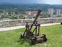 Certains le décrivent comme une petite catapulte capable d'envoyer des petits projectiles à 30 m de distance ou 40 m de haut, d'autres comme une baliste.