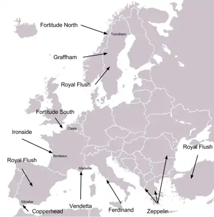 Bodyguard incluait l'opération Fortitude (diversion d'appui à Overlord), subdivisée en deux parties majeures, l'opération Skye (britannique) et l'opération Quicksilver (américaine).