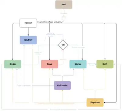 | Icehouse | [17] | Nova, Glance, Swift, Horizon, Keystone, Neutron, Cinder, Heat, Ceilometer, Trove | (en)Note de version IceHouse |