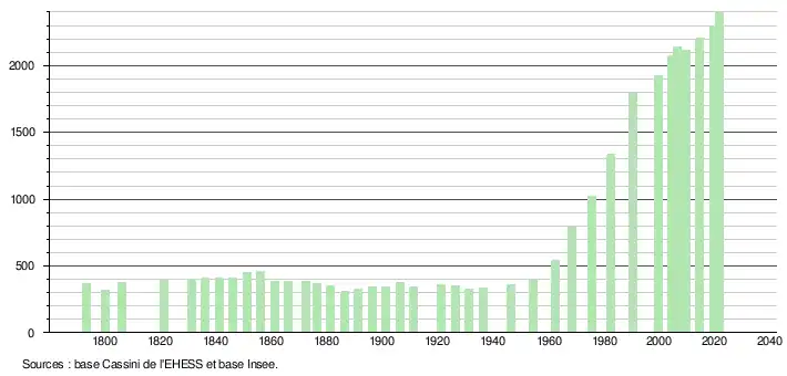 L'évolution du nombre d'habitants est connue à travers les recensements de la population effectués dans la commune depuis 1793. Pour les communes de moins de 10 000 habitants, une enquête de recensement portant sur toute la population est réalisée tous les cinq ans, les populations légales des années intermédiaires étant quant à elles estimées par interpolation ou extrapolation[24]. Pour la commune, le premier recensement exhaustif entrant dans le cadre du nouveau dispositif a été réalisé en 2004[25].