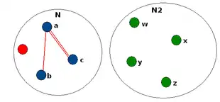 Sur le schéma d'algorithme de sélection des MPR, l'ensemble N est constitué des voisins à un saut du nœud (ici en rouge), dont on veut déterminer les MPR. Un saut correspond à tous les voisins qui ont répondu au message Hello, cela correspond à la portée radio pour les réseaux Wi-Fi[26],[27].