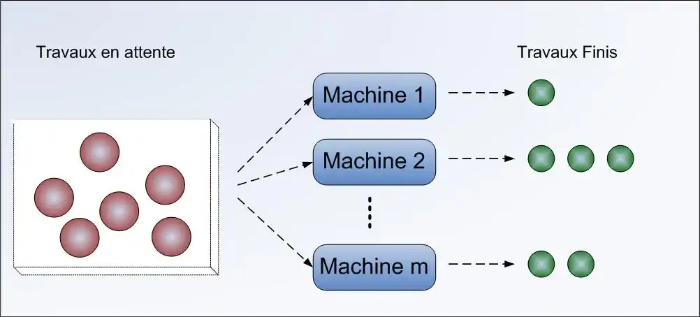 Dans ce cas, on dispose d’un ensemble de machines identiques pour réaliser les travaux. Les travaux se composent d’une seule opération et un travail exige une seule machine. L’ordonnancement s’effectue en deux phases : la première phase consiste à affecter les travaux aux machines et la deuxième phase consiste à établir la séquence de réalisation sur chaque machine.