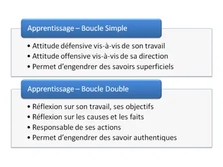 Pour Chris Argyris et Donald Schön, il y a deux niveaux d'apprentissage. Il y a apprentissage en « simple boucle » (single loop) lorsque les acteurs sont capables de détecter une erreur et se contentent de la corriger. Il y a apprentissage en « double boucle » (double loop) lorsqu'il ne s'agit plus seulement de corriger une erreur mais de modifier la façon de penser[15]. Seule l'organisation capable de modifier les valeurs qui guident les stratégies d'action peuvent être qualifiées d'« organisation apprenantes ». La communication réflexive commune est alors un élément incontournable de la production, il s’agit de réfléchir pour agir, les acteurs sont aussi des chercheurs, mais surtout des trouveurs impliqués dans l’action. L’organisation apprenante permettra d’apprendre à apprendre de son expérience.