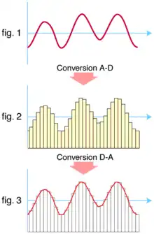 La restitution du son original se fait en réalisant l’opération inverse qui consiste à lire l’information numérique stockée en mémoire et à la convertir en signal analogique : on utilise pour cela un convertisseur Digital-Analogique ou D-A (fig. 3) (en anglais DAC pour Digital to Analog Converter). C'est le nombre de convertisseurs qui détermine la capacité de l'orgue numérique à gérer simultanément la conversion de plusieurs échantillons.