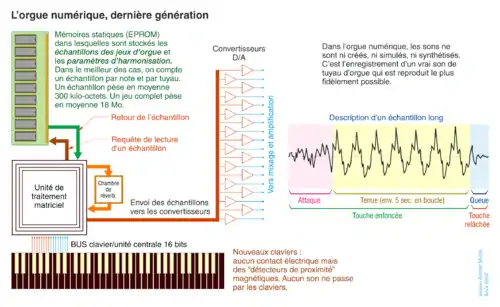 L’orgue numérique est donc l’héritier direct de cette technologie de l’échantillonnage. Les sons produits ne sont plus générés électroniquement par des oscillateurs, ni synthétisés (comme c’était le cas sur les anciens générateurs analogiques), mais ils sont stockés dans une mémoire statique (en général une eprom, parfois un disque dur) et proviennent d’un véritable orgue à tuyaux dont un nombre déterminé de notes a été soigneusement enregistré à l’aide de deux ou quatre microphones. Un enregistrement à deux microphones donne un son stéréophonique ; un enregistrement à quatre microphones donne un son 3D (codage THX 5.1, présence spatiale). La qualité globale d’un orgue numérique dépend donc du nombre et de la qualité de ses échantillons individuels. Le soin apporté à l’enregistrement de chaque jeu et la qualité de l'amplification choisie conditionnent le résultat final.