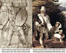 - la ressemblance entre les vêtements daces et les habits traditionnels roumains, comme le montre la Colonne Trajane ;