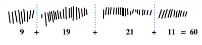 L'inventeur nota que la colonne (c) est compatible avec un système de numération de base 10, du fait que les entailles y sont groupées comme :