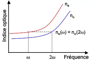 Cette égalité semble impossible puisque et qu'en plus les trois ondes doivent respecter la conservation de l'énergie, . En réalité, dans certains matériaux, appelés biréfringents, ou anisotropes, l'indice de réfraction dépend également de la polarisation. Grâce à ce degré de liberté supplémentaire, il est possible de réaliser l'accord de phase entre des ondes de fréquences différentes, à condition que leurs polarisations soient judicieusement choisies. Dans les milieux non linéaires isotropes en revanche, ce type d'accord de phase n'est pas possible : c'est la technique du quasi-accord de phase qui est alors utilisée.