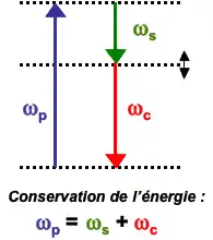 Lorsque le milieu non linéaire est éclairé par un faisceau de lumière cohérente de fréquence ωp, appelé faisceau de pompe, deux autres faisceaux sont produits : le faisceau signal de fréquence ωs et le faisceau complémentaire de fréquence ωc. Il n'existe pas de convention générale pour définir le signal par rapport au complémentaire (même si dans la majorité des publications sur le sujet le signal a la longueur d'onde la plus courte des deux). Les fréquences signal et complémentaire sont forcément inférieures à la fréquence de pompe, et doivent impérativement satisfaire la relation suivante :