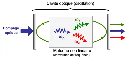 - un milieu non linéaire, à l'origine de la conversion de fréquence effectuée par l'OPO. Ce milieu créé un gain non linéaire pour les ondes signal et complémentaire. Ce milieu est souvent un cristal non linéaire, comme le niobate de lithium ;