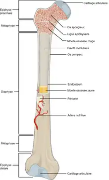 • les épiphyses, situées aux extrémités : une épiphyse distale (caudale) et une proximale (crâniale). Elles sont formées de tissu spongieux, très riches en moelle rouge hématopoïétique et recouvertes de cartilage articulaire,
