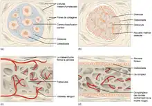 • une partie centrale (os spongieux) : ce tissu spongieux est riche en cellules conjonctives adipeuses et en éléments sanguins mais sa résistance est faible (en cas de fracture, il s'écrase facilement). Il est situé notamment dans l'os trabéculaire des os longs (à l'intérieur des épiphyses)