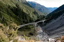 Terminé en 1999 par la société ‘McConnell Smith Pty Ltd’, il avait 440 m de long, quatre piliers et conduisait la route State Highway 73/S H 73 (en) au-dessus d’une étendue de terres instables, remplaçant une section de route étroite, sinueuse et dangereuse, qui était soumise à un grand risque d’avalanches, de glissements de terrain, occasionnant des fermetures fréquentes[6]