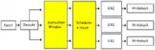 Certains algorithmes un peu plus évolués sont capables non seulement d’exécuter les instructions dans le désordre, mais aussi de les Issue dans le désordre. Ces algorithmes peuvent être vus comme des variations du scoreboarding ou de l'algorithme de Tomasulo, mais auxquels un circuit a été ajouté : l'Instruction Window, aussi appelée Issue Queue. Ce circuit est une mémoire tampon, intercalée entre l'étage d'Issue et l'étage précédent (décodage ou renommage de registres). Cette mémoire tampon va servir à stocker des instructions tant que celles-ci ne sont pas prêtes à être exécutées. Ainsi, si une instruction ne peut être exécutée, pour cause de dépendance structurelle ou de dépendance non-résoluble, elle ne bloquera pas le reste du pipeline. À la place, de nouvelles instructions pourront être chargées et être envoyées aux unités de calcul si elles le peuvent.