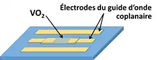 Les logiques de fonctionnement des deux configurations sont inverses car dans le premier cas (configuration série), le dispositif est passant lorsque le VO2 est dans son état métallique, alors que pour le second (configuration parallèle), lorsque le VO2 est métallique, la ligne de transmission est reliée à la masse et le signal est interrompu. Il a été montré que ce type de composant présente, par activation thermique, d’excellentes caractéristiques d’isolation, au-delà de 30 à 40 dB d'isolation du signal RF (entre 500 MHz et 35 GHz)[51]. Toutefois, le recours à l'activation thermique pour contrôler l'état du dispositif présente peu d’intérêts applicatifs dans le domaine des RF. L'activation électrique semble une voie plus prometteuse quant à l'utilisation de ces dispositifs[52]. Ce mode d'activation présente un autre avantage, sa rapidité. En effet, J. Leroy et al.[53] rapportent un temps de commutation de 4,5 ns.