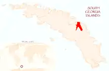 Carte de la Georgie du Sud avec la Baie de Cumberland en rouge ; à droite se trouve la péninsule.