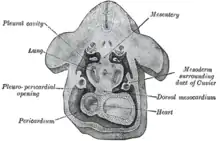 L'ébauche embryologique du cœur est présente dès la fin de la 3e semaine de vie intra-utérine (au stade carnégie 9) à la suite de la fusion des deux tubes endocardiques, formant ainsi le tube cardiaque primitif. Cette ébauche se situe en avant de la plaque neurale, au sein du mésoblaste crânial. Le feuillet viscéral du péricarde provient du mésoblaste splanchopleural entourant le tube cardiaque primitif[embryo 1]. Tandis que l'épicarde dérive de la séreuse proépicardique[embryo 2]. Le péricarde va s'étendre et entourer les ébauches myocardiques et cardiaques. Notons que la zone de fusion postérieure de ces feuillets splanchnopleuraux s'appelle le mésocarde (bien que cette structure soit transitoire et finira par s'apoptoser)[embryo 3].