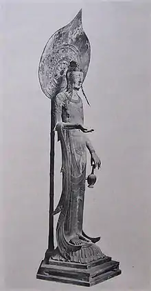 Les statues de Hōryū-ji sont de bons exemples de sculptures de la période Hakuhō ; presque toutes datent de cette période. La plupart sont en bois, tirées d'un seul bloc pour les corps et de blocs séparés pour les éléments secondaires, tels que les démons sur lesquels la divinité marche, le halo et des parties de ses vêtements. Toutes étaient à l'origine peintes et dorées, et avaient des formes plus rondes avec un impact tridimensionnel plus fort que les statues de la période Asuka, des décennies précédentes. Ainsi, ils reflètent de fortes influences stylistiques des Trois Royaumes de Corée (57 AEC - 668 EC), et de l’héritage stylistique des dynasties Qi (550-577) et Sui (581-618) du Nord qui l’ont précédée, puis de la Chine sous la dynastie Tang (618-907). Un autre groupe de statues du même temple montre un autre développement important, à savoir la première utilisation de la laque sèche, non seulement en tant qu’enduit protecteur ou décoratif pour les statues, mais aussi en tant que matériau à partir duquel des accessoires, tels que des bijoux de bodhisattva, des ornements pour cheveux et des détails tels que les doigts, pouvaient être pensés pour être attachés à l'armature sous-jacente, en bois et argile.