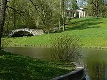 Depuis le palais, sur la rive opposée de la Slavianka, s'ouvre un panorama avec une cascade, un pont et la colonnade d'Apollon. Cette dernière, de forme circulaire, fut agrémentée d'une statue en bronze d'Apollon, mais, vers 1800, une tempête mutila l'édifice qu'on laissa en l'état avec une partie en arc de cercle préservée, le reste des colonnes jonchant le sol, et une nouvelle statue d'Apollon rajoutée en 1826.