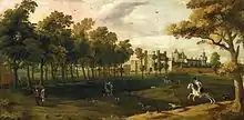 Façade sud du palais de Sans-Pareil au XVIe siècle d’après le détail d’une gravure de Joris Hoefnagel (1582) | |||