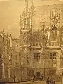 Dans le premier quart du XXe siècle[2], on se préoccupe de rétablir dans sa forme ancienne l'escalier de la Salle des procureurs, le long de la rue aux Juifs[14]. Menaçant ruine, l'original construit en 1531 par Jean Delarue et Étienne Guiffart[2], avait disparu dans les années 1830, remplacé par une œuvre néogothique d'Henri Charles Grégoire. S'appuyant sur les dessins réalisés en 1824 par Richard Parkes Bonington (aujourd'hui au Centre d'art britannique de Yale), le travail confié à l'architecte Lucien Lefort en 1902, créa alors une vive polémique, connue sous le nom de l'« affaire de l'escalier »[14]. Devant un tel tollé, la commission des monuments historiques se voit contrainte d'accepter dès le début de l'année 1903 sa démolition et son remplacement par un nouvel escalier dont la construction fut alors confiée à Paul Selmersheim[14], inspecteur général des monuments historiques depuis 1885[15].