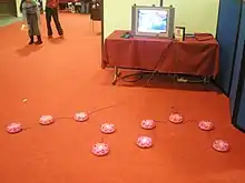 Les cinq plots du jeu Para Para Paradise présentés en arc de cercle. Le joueur se positionne au centre et doit effectuer des mouvements de bras en coordination avec les informations affichées à l'écran.