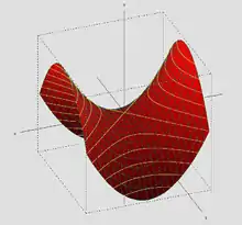 La forme particulière de cette surface lui vaut le surnom « selle de cheval ». Le schéma ci-contre représente, pour et compris entre –1 et 1, la surface d'équation . On reconnaît, en jaune, des hyperboles « horizontales » qui dégénèrent en droites sécantes pour , et, en violacé, des paraboles « verticales ».