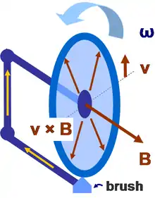 Si maintenant nous considérons l'expérience non pas du point de vue de l'observateur au repos, mais comme un observateur se déplaçant avec le disque (en rotation autour de l'axe), nous mesurerons toujours une tension nulle entre deux points fixes du disque, comme s'il ne se passait rien ; car le champ magnétique est indépendant de toute rotation de l'aimant. Par contre, une tension d'induction sera mesurée dans le circuit entre les contacts glissants rotatifs (pour cet observateur) ; car ce circuit est un conducteur se déplaçant (tournant) dans un champ magnétique.