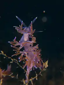 Comme les autres nudibranches, cette espèce est hermaphrodite : l'accouplement a lieu à la fin du printemps[3]. La ponte (ou « oothèque ») est blanchâtre ou rosâtre[10],[11] et consiste en un cordon en spirale composé de milliers d’œufs d'environ 70 µm : le nudibranche le dépose sur les branches des hydraires[3],[6]. De ces œufs éclosent des larves véligères.