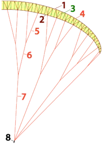 On appelle « caisson » la partie de l'aile située entre deux points d'attache de suspentes et « alvéole » celle située entre deux cloisons internes.