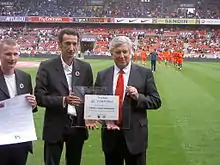 Jean-Louis Triaud, président des Girondins de Bordeaux, et Pascal Brethes, cofondateur du Paris Foot Gay, lors de la signature de la Charte contre l'homophobie des Girondins de Bordeaux - l'AJ Auxerre, le 16 mai 2009