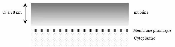 Elle est épaisse (entre 15 et 80 nm) (elle ne laisse pas passer l'éthanol), composée d'une épaisse couche de muréine ou peptidoglycane. Cette épaisse couche est traversée par des acides téichoïques ou lipotéichoïques.