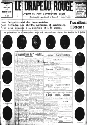 Cette contestation vaut aux communistes belges une offensive de l'État à leur égard. Le , 54 communistes belges sont arrêtés sur toute l'étendue du territoire. Le , 15 d'entre eux sont inculpés devant la Cour d'assises pour « avoir comploté pour détruire ou changer, par les armes au besoin, la forme de gouvernement »[6].