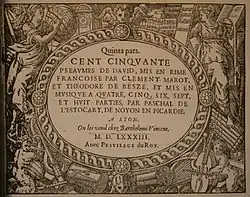 - Cent cinquante pseaumes de David mis en rime françoise par Cl. Marot et Th. de Beze mis en musique à quatre, cinq, six, sept et huit parties... Lyon, Barthélémy Vincent, ou Genève, Eustache Vignon, 1583 (impr. Genève : Jean II de Laon). RISM L 2076, Guillo 1991 n° Index 71. Même portrait gravé sur bois que dans les Octonaires.