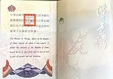 - « 中華民國外交部部長茲請各國有關機關對持用本護照之中華民國國民允予自由通行,并請必要時儘量予以協助及保護。 »