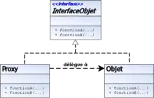 - Ce patron est un substitut d'un objet, qui permet de contrôler l'utilisation de ce dernier[11]. Un proxy est un objet destiné à protéger un autre objet. Le proxy a la même interface que l'objet à protéger. Un proxy peut être créé par exemple pour permettre d’accéder à distance à un objet (via un middleware). Le proxy peut également être créé dans le but de retarder la création de l'objet protégé — qui sera créé immédiatement avant d'être utilisé. Dans sa forme la plus simple, un proxy ne protège rien du tout et transmet tous les appels de méthode à l'objet cible[14].
